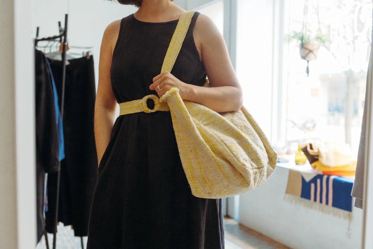 Die Baumwolle wird mit Kurkuma gefärbt und Essig fixiert. Durch diese natürliche Verarbeitung ohne Einsatz von Chemikalien bleicht der Stoff bei Sonneneinstrahlung schneller aus.