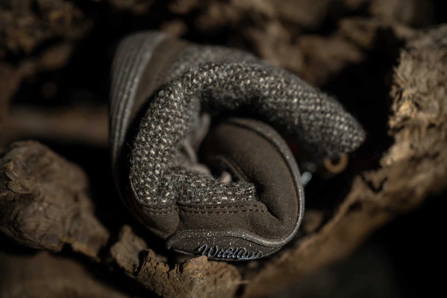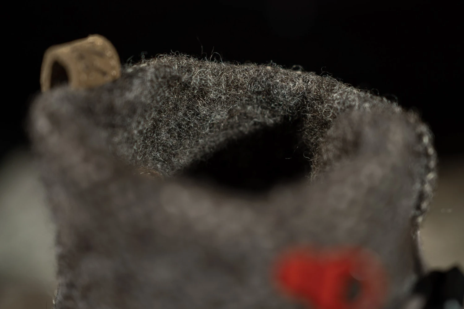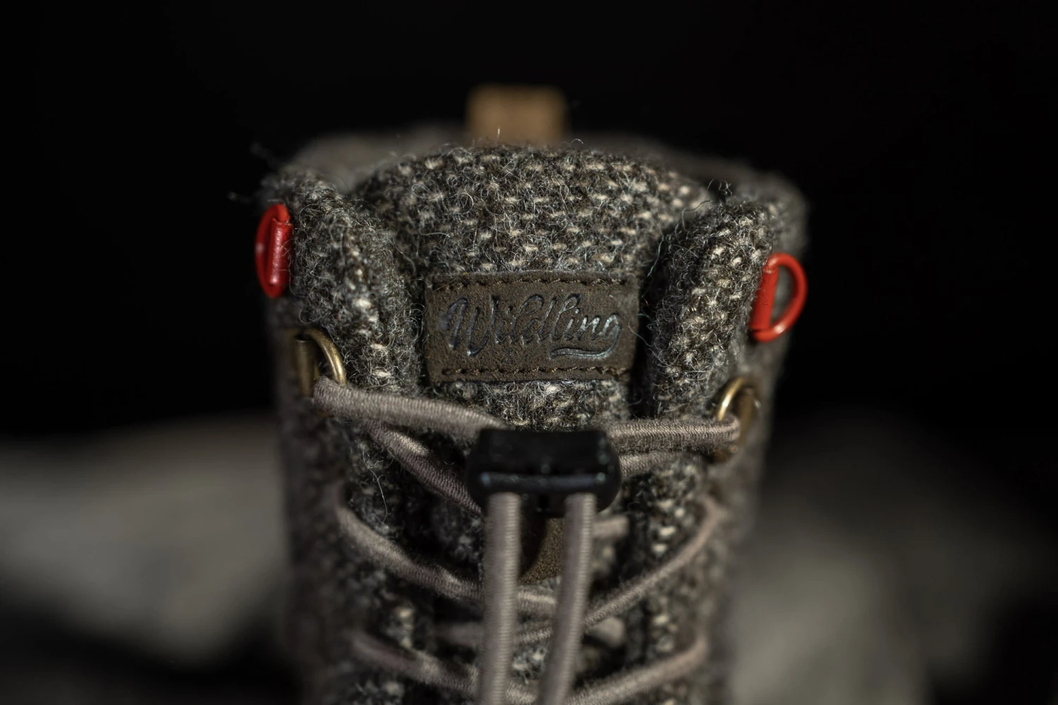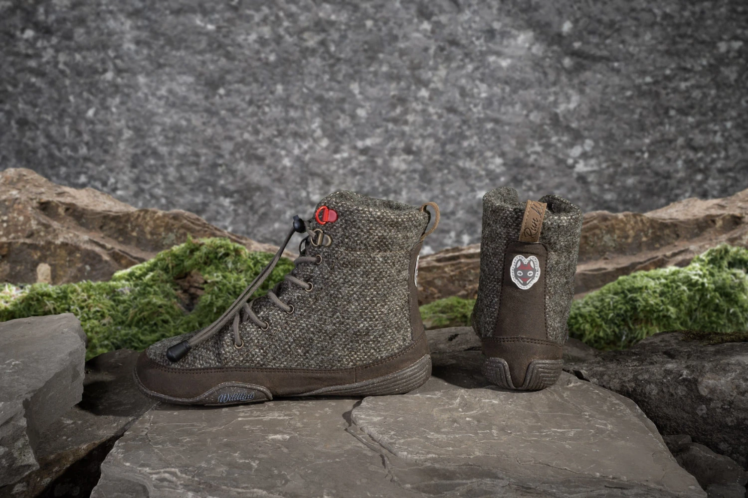 Das High Cut Modell sorgt mit Schurwolle als Obermaterial und Innenfutter für wohlig warme Füße auch an kalten Tagen. Durch die dichte Leinwandbindung des braun-beige melierten Oberstoffs von unserem Partner Nordwolle wird Kälte von außen abgehalten, während der Walkloden innen ein angenehmes Fußklima aufrechterhält.