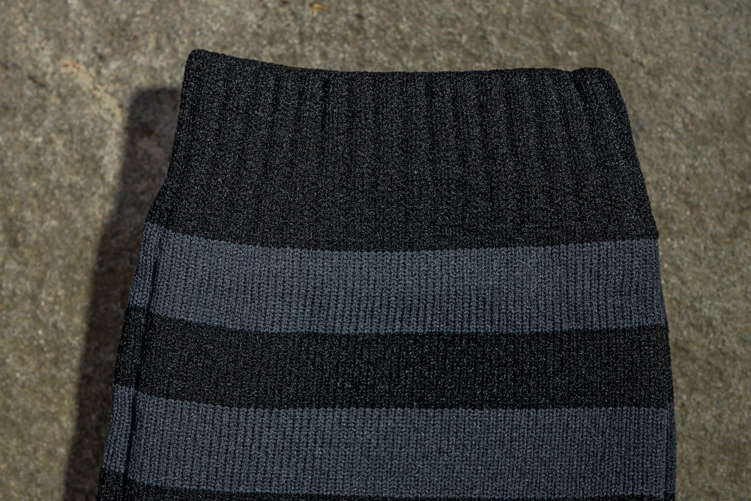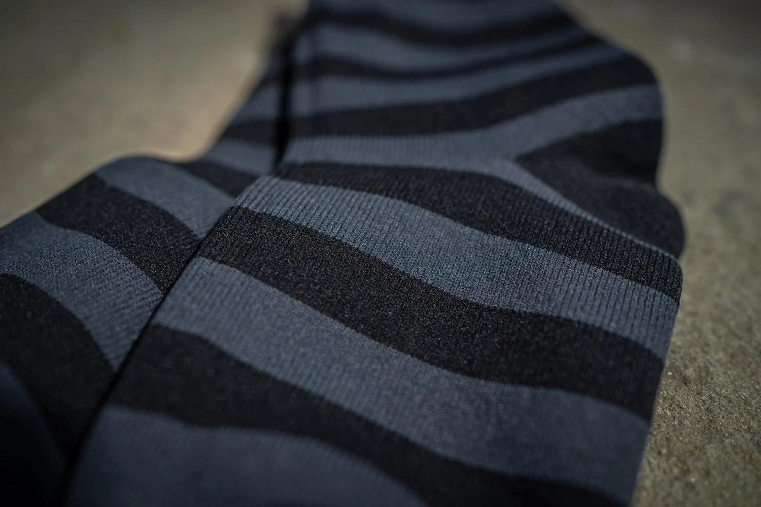 | Außenmaterial: Futter: Zwischenmaterial: Farbe: | 96 % Nylon, 3 % Elasthan, 1 % Elastikbündchen 70 % Bambusfaser, 30 % Nylon Porelle-Membran grau-schwarz gestreift |