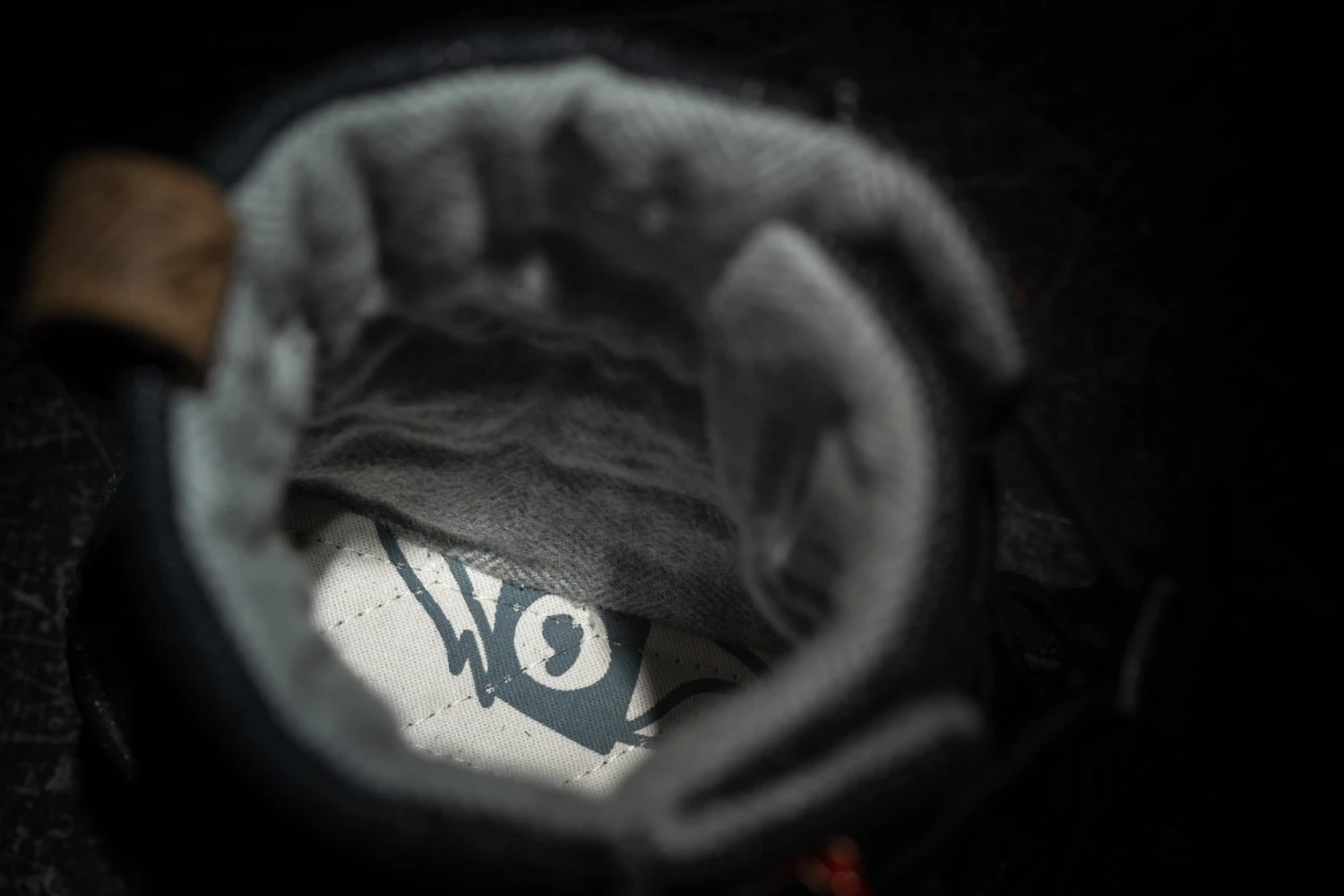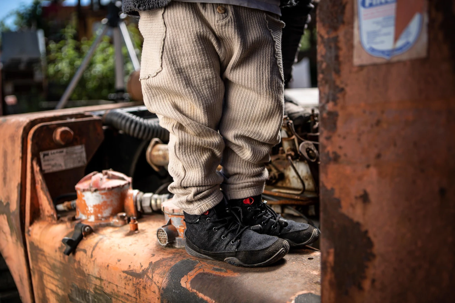 Nicht nur seine schwarze Denim-Optik macht diesen High Cut zu etwas ganz Besonderem: Die offenen Verschlusskanten des Oberstoffes bilden mit der Zeit Fransen und sorgen so für ein noch individuelleres Aussehen. Mit seinem Obermaterial aus kontrolliert biologischem Baumwoll-Twill und dem Innenfutter aus Hanf-Flachs-Vlies sorgt dieser Wildling ganz ohne tierische Materialien für Schutz und wohlige Wärme.