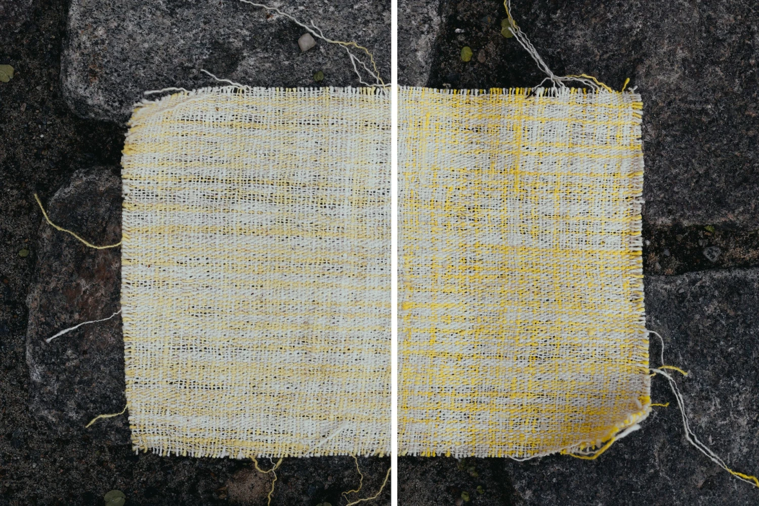 Die Baumwolle wird mit Kurkuma gefärbt und Essig fixiert. Durch diese natürliche Verarbeitung ohne Einsatz von Chemikalien bleicht der Stoff bei Sonneneinstrahlung schneller aus.