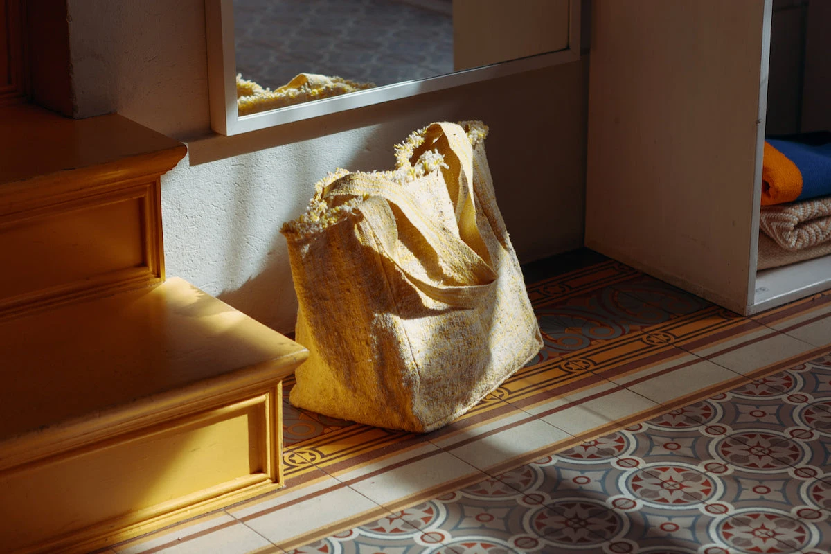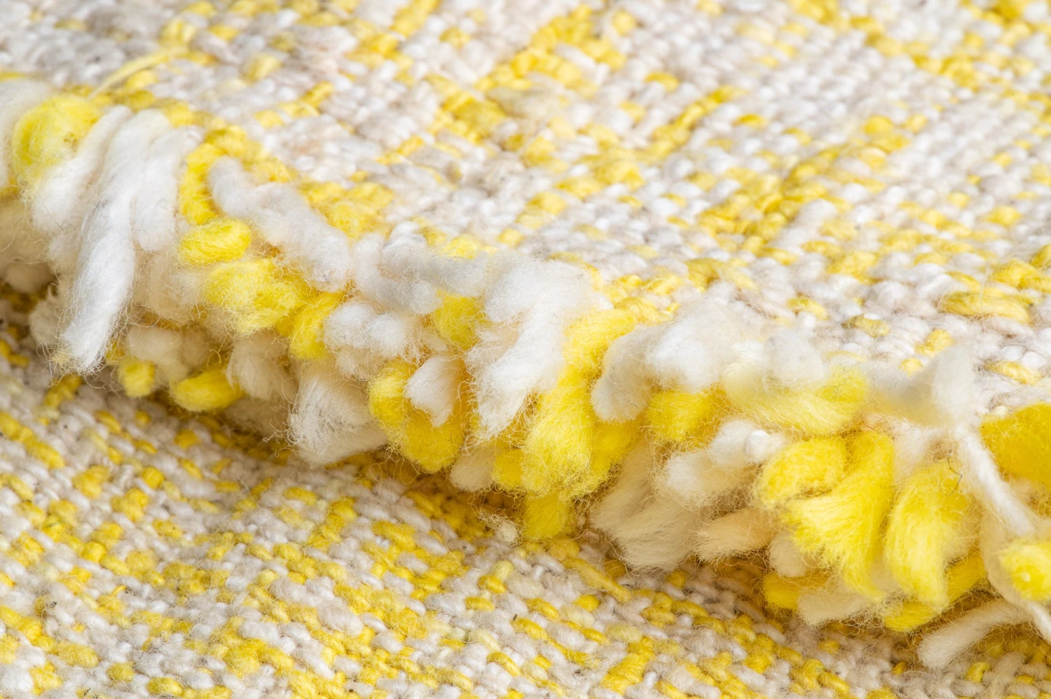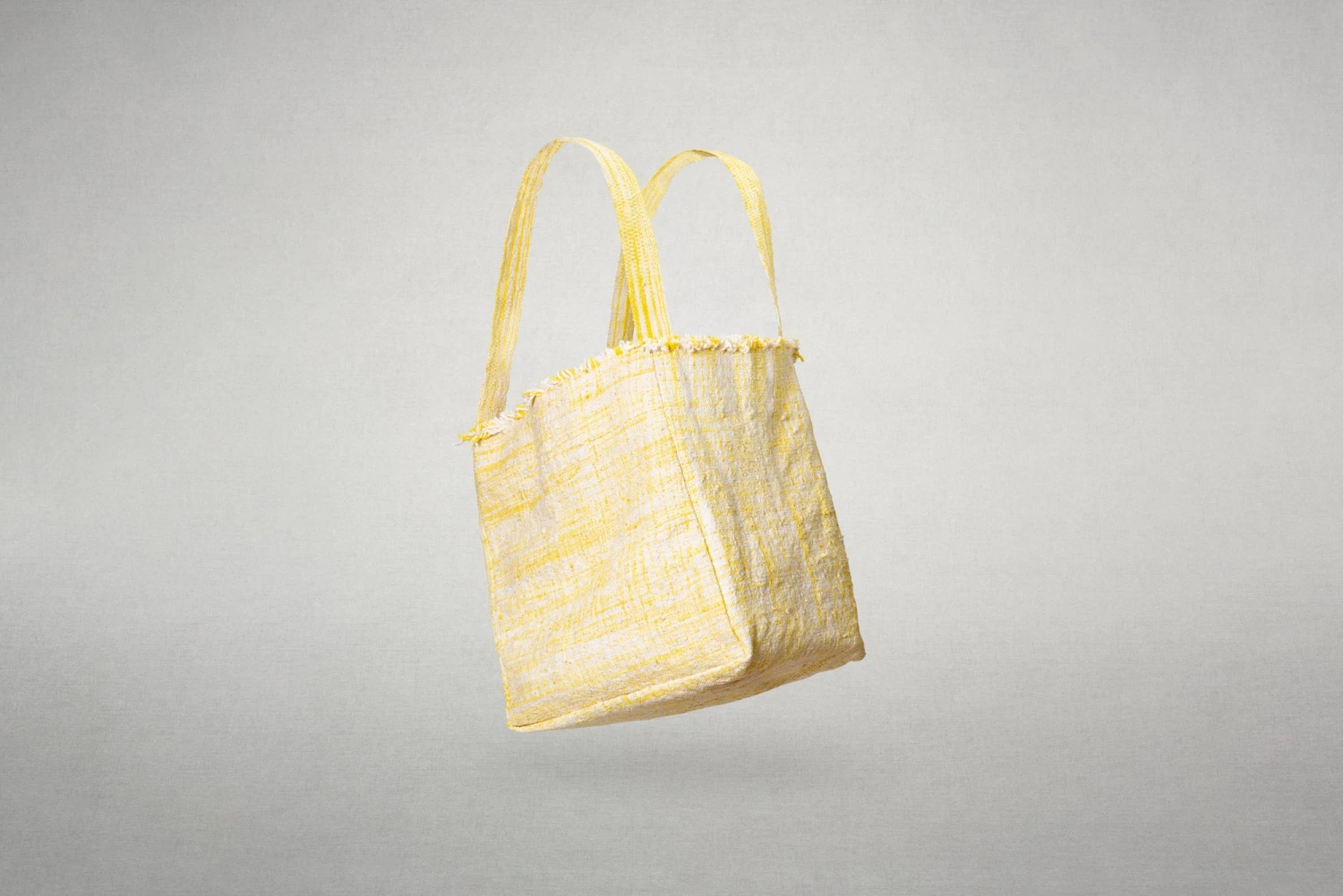 In einem natürlichen Verfahren wurde die handgesponnene Baumwolle mit Kurkuma gelb gefärbt. Das traditionelle Ikat-Verfahren verleiht jeder Tasche eine individuelle und lebendige Schönheit.